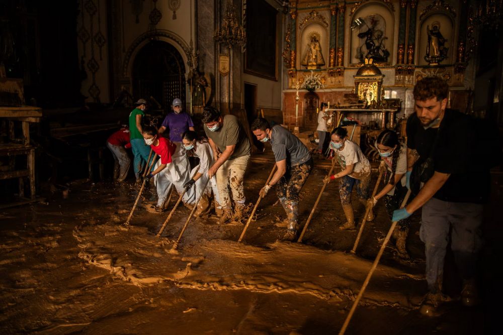 Des volontaires nettoyant l’église Sant Jordi Mártir (photo de Santi Palacios)